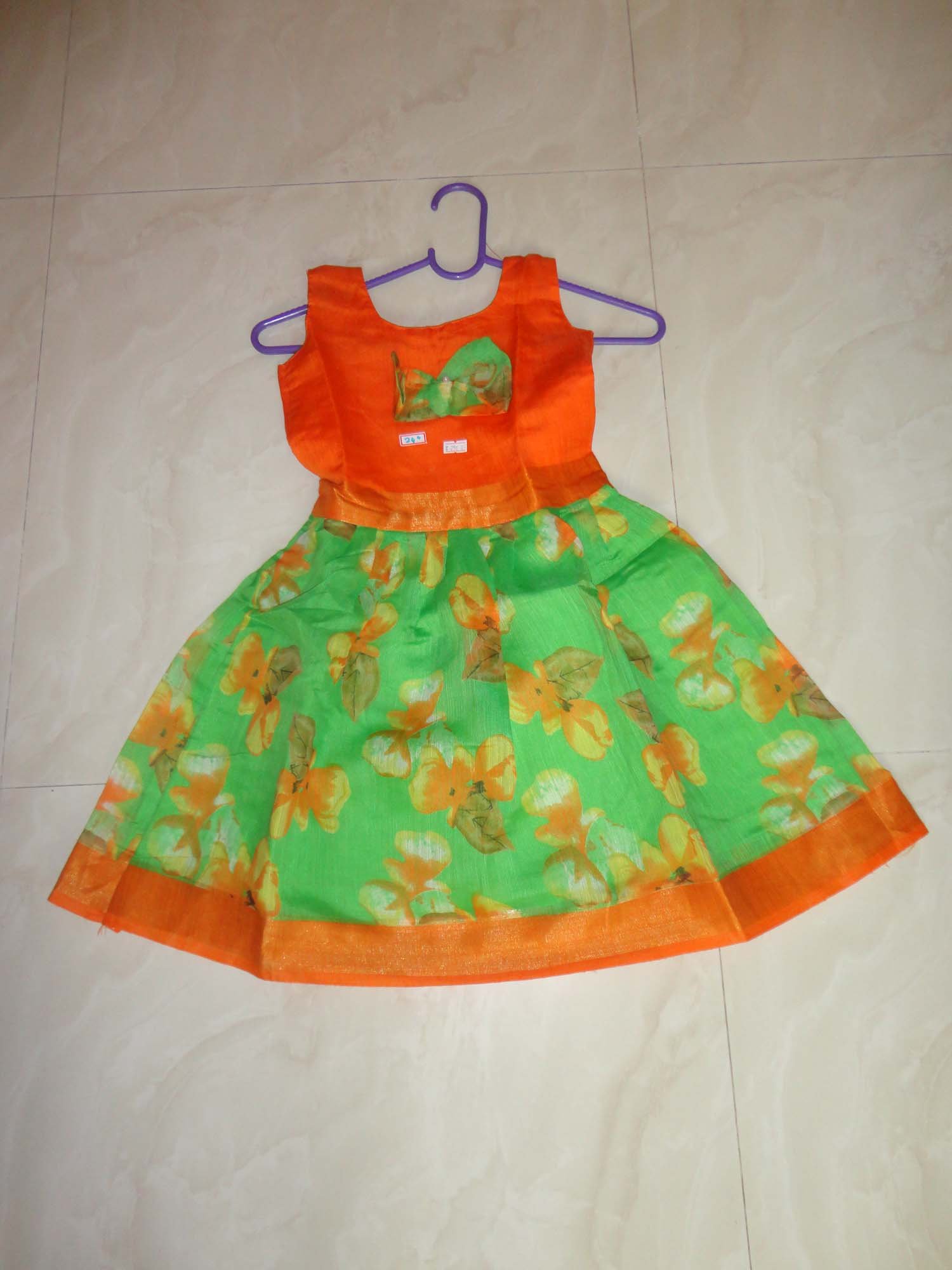 These frocks are stitched from linen cotton saree with full lining and the yoke part is given in contrast to the saree. A small bow with one pear in the middle is been stitched in the front side of the frock, back side of the frock has a single big button alone