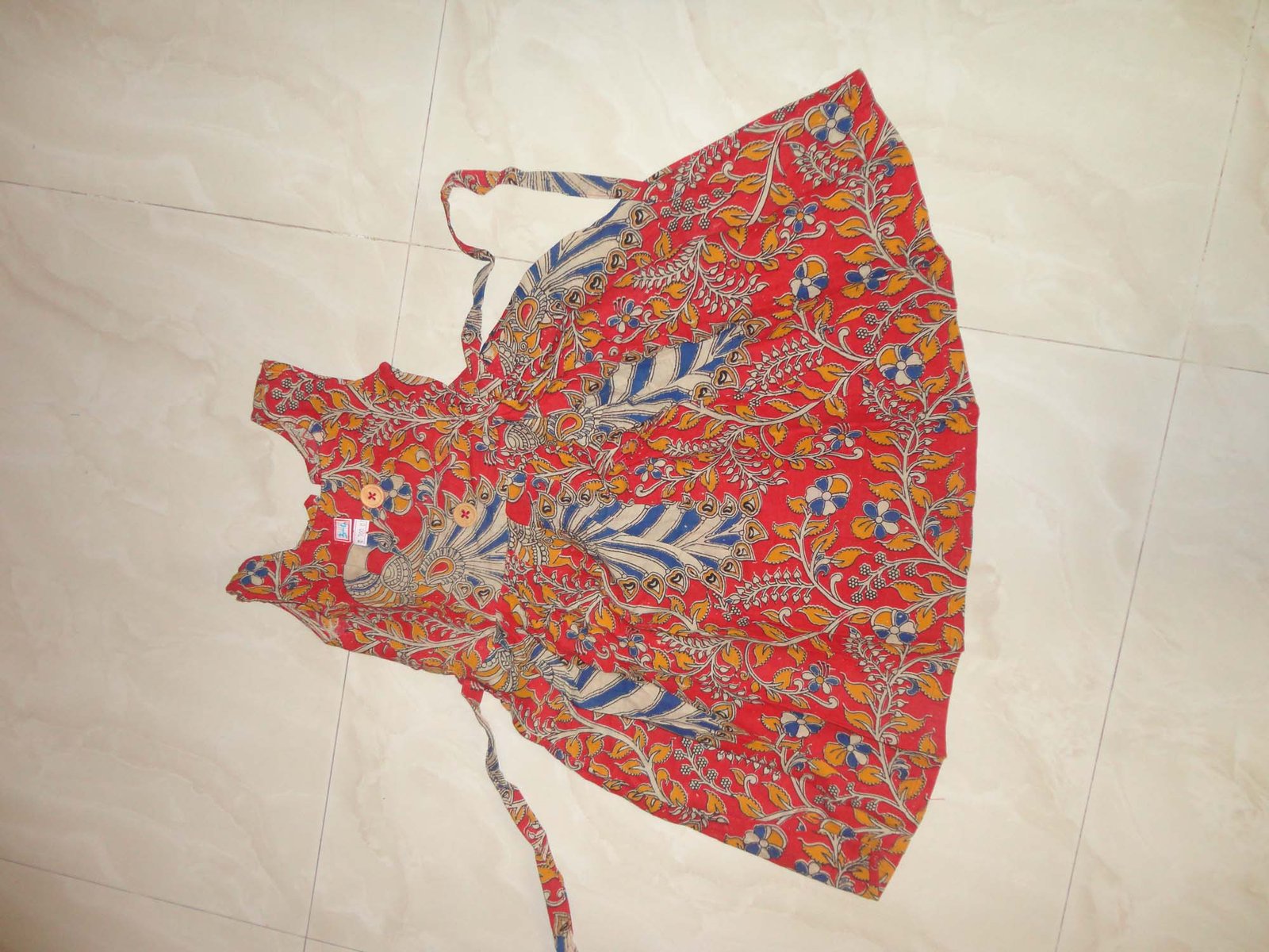 Perfect wear for the summer season with side rope. These frocks can used as daily wear and it has a button at the backside. This is kalamkari cotton material which will be soft and the colour will be sobber due the kalamkari process.