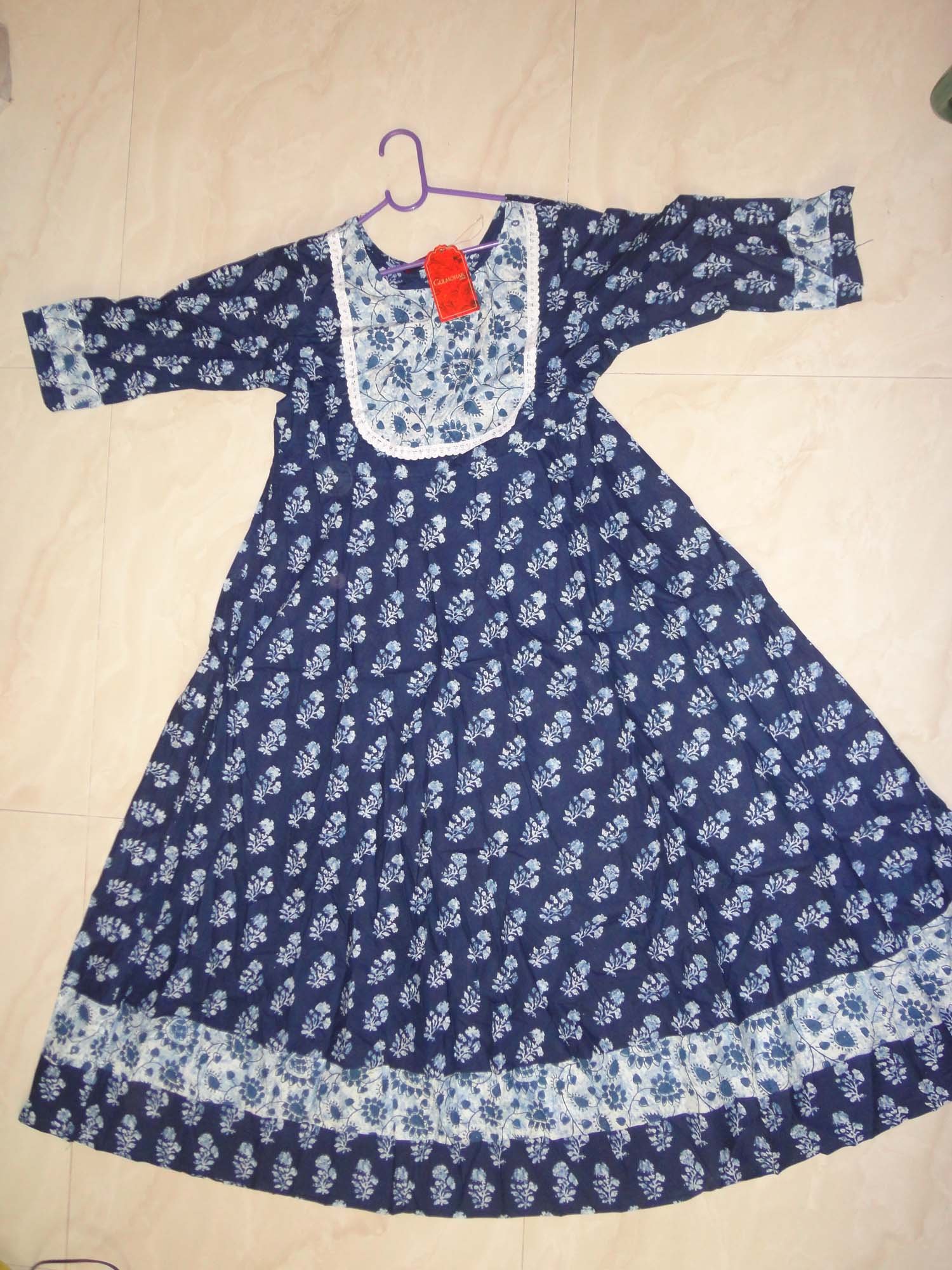 These are Gulmohr Branded Kurtis without lining. Cotton gown type kutis can be worn to office. This type of kurti has a slit in th front and it is a type of bhandhini work and lace work in the yoke part.