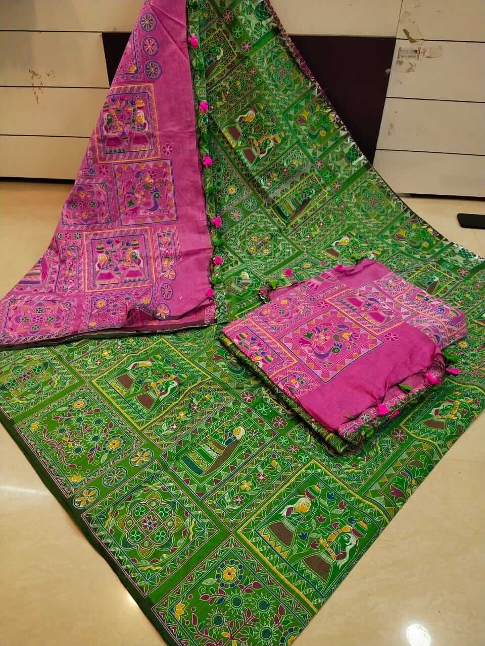 These prints are inspired from the time of ramayana. It is a type of folk-art form. Madubhani paintings were done to celebrate the wedding of Lord Ram and Seetha. Easy to drape for everyday office.