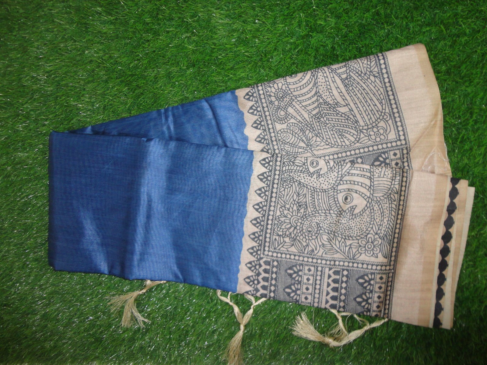 This type of saree is a blend of silk and tussar silk. Its known for its unique design and appearances. Casual wear saree. Madhubani print semi tussar saree.