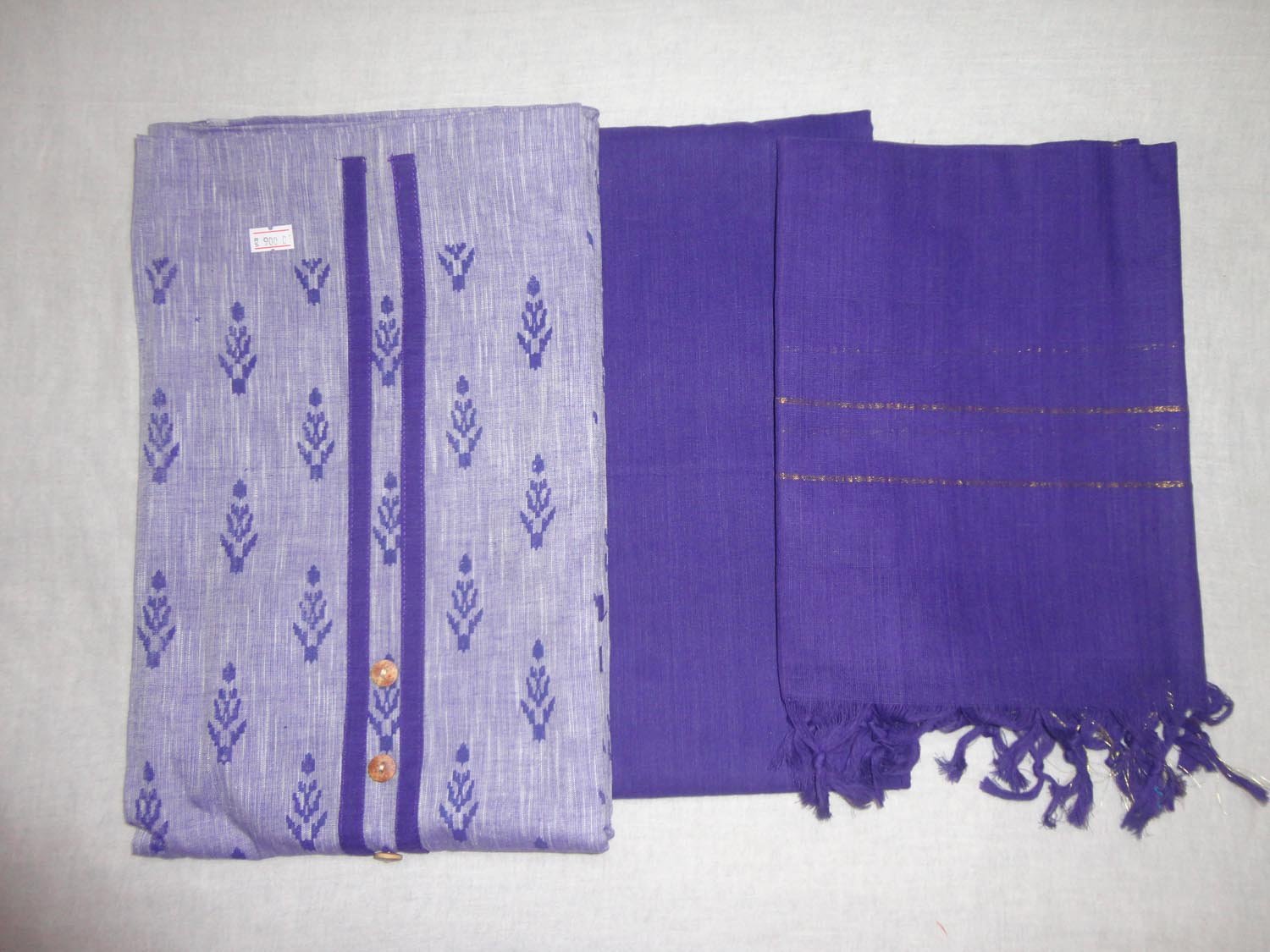 These are handloom cotton salwar. This salwar has top, bottom and dupatta. The top has buttons in the yoke, plain botton and gold zari lines in the dupatta with tassels at both the ends.